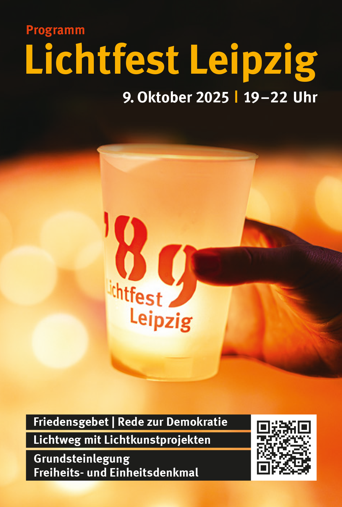 Jedes Jahr am 9. Oktober gedenkt das Lichtfest Leipzig der Montagsdemonstrationen im Herbst 89, die den Sturz des SED-Regimes zur Folge hatten und den Weg zur Deutschen Wiedervereinigung ebneten. Am 9. Oktober 2025 erwartet die Lichtfestgäste ein Lichtfest der besonderen Art: Von 19 bis 22 Uhr bilden fünf Lichtkunstprojekte ost- und westdeutscher Kunstschaffender entlang des Neumarkts und im Schillerpark einen Lichtweg, der zum Erinnern und Reflektieren über den Herbst 89 einlädt. Der Lichtweg leitet die Lichtfestbesucherinnen und -besucher von der Nikolaikirche als Ausgangspunkt der Friedlichen Revolution über den Neumarkt bis zum Wilhelm-Leuschner-Platz, dem künftigen Standort des Leipziger Freiheits- und Einheitsdenkmals.