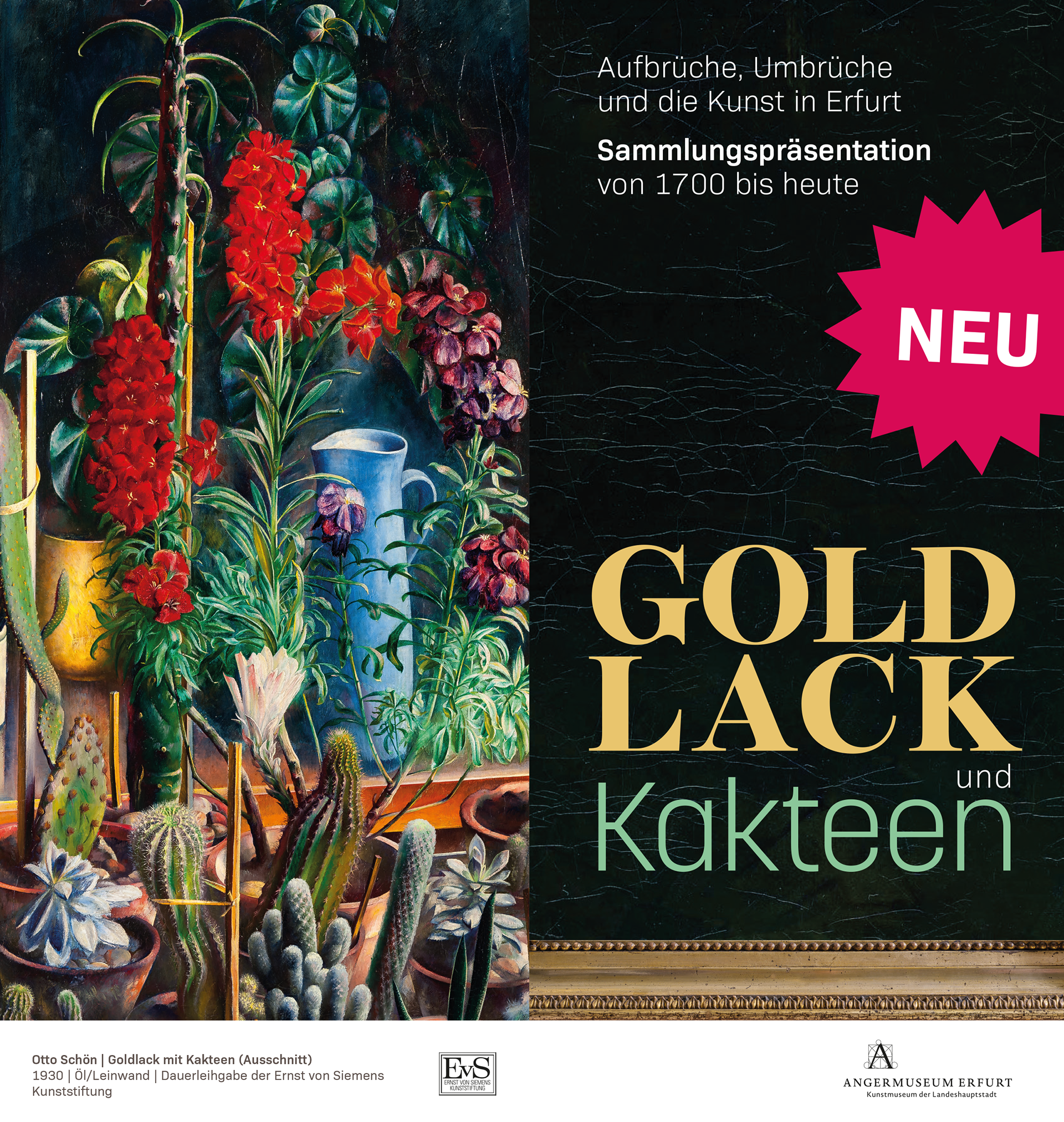 Der Titel der Sammlungspräsentation „Goldlack und Kakteen“ nimmt Bezug auf ein Gemälde von 1930 des gebürtigen Thüringer Malers Otto Schön. Das Stillleben mit dichten Reihen von Kakteen, überragt von blühendem Goldlack und anderen Gewächsen, vermittelt eine Unruhe, die wie ein künstlerischer Reflex auf die politisch-gesellschaftlichen Spannungen der Zeit zwischen dem ersten und zweiten Weltkrieg wirkt. Der Blick auf das seismographische Potenzial von Kunst des 18. bis 21. Jahrhunderts soll Impulse für das Verständnis der Gegenwart geben und zu Gesprächen und Diskussionen einladen.